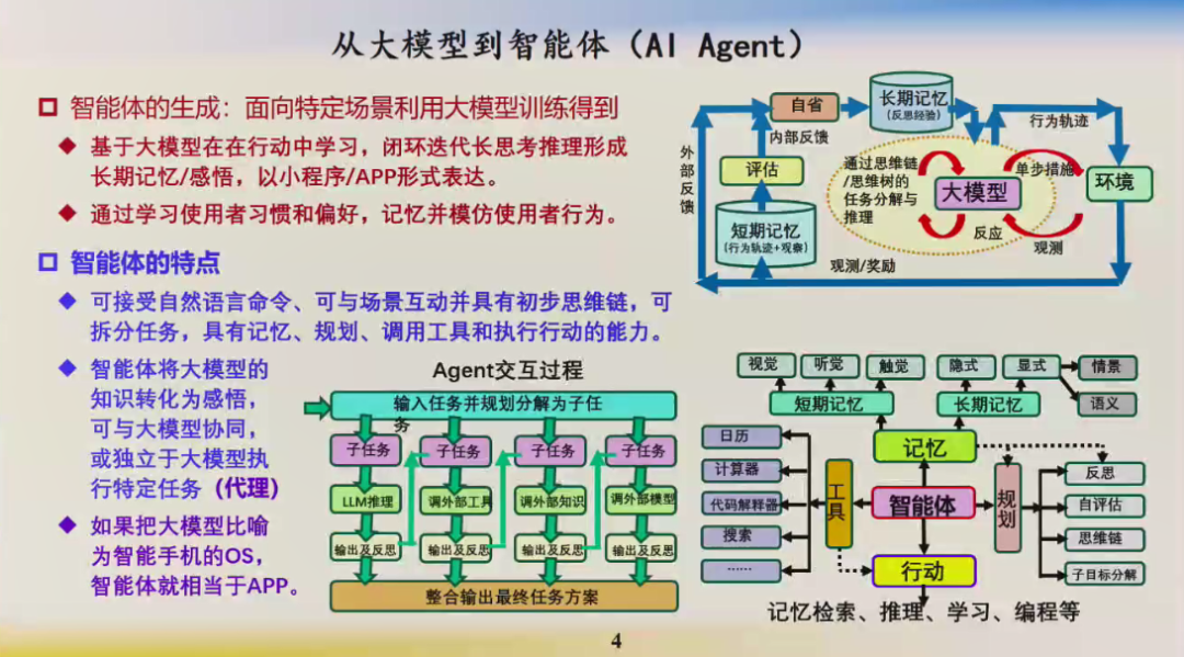 智能体将大模型的知识转化为感悟,可与大模型协同,或独立于大模型执行特定任务(代理)。如果把大模型比喻为智能手机的OS,智能体就相当于APP。