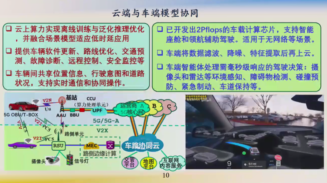 车联网更是体现了云端与车端的协同配合。在云端,我们能够进行模型训练与推理,同时完成车辆软件的更新以及车辆间的信息共享。而在车端,车辆将具备约2Pflops的计算能力,足以支持智能座舱的运行,并实现毫秒级的处理速度。例如,当车辆感知到右下方的路况时,驾驶者不仅能看到前方的情况,还能通过车内的系统感受到全局信息。这种能力不仅能帮助驾驶者更好地理解路况,还能引导他们进行智能驾驶决策。