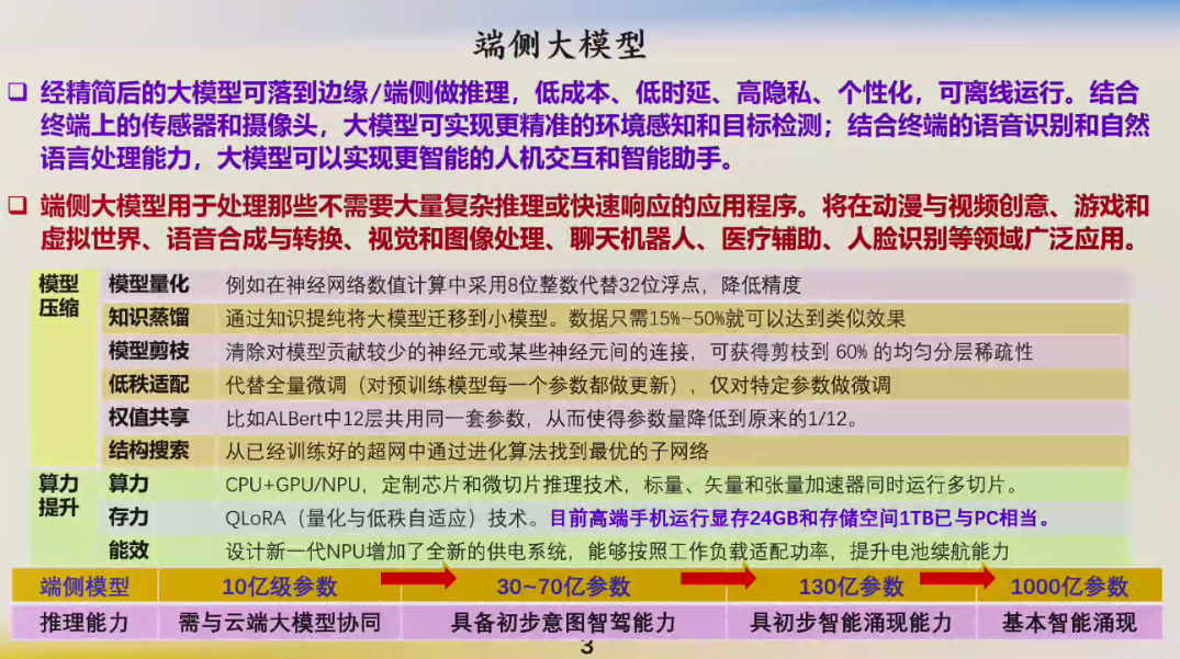 刚才提到,大模型的发展需要向端侧迈进,通过精简大模型使其能够部署到端侧。除了模型压缩之外,端侧的算力也需要提升。通过这些技术手段,目前大多数手机已经能够实现大约10亿参数的推理能力,但这仍然无法满足终端智能的全部需求。当前,有些高端手机已经具备支持70亿参数推理的能力,未来有望实现百亿甚至千亿参数的推理能力。